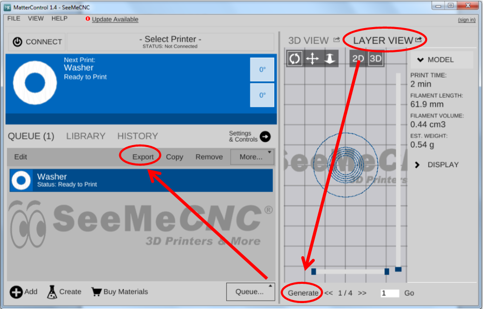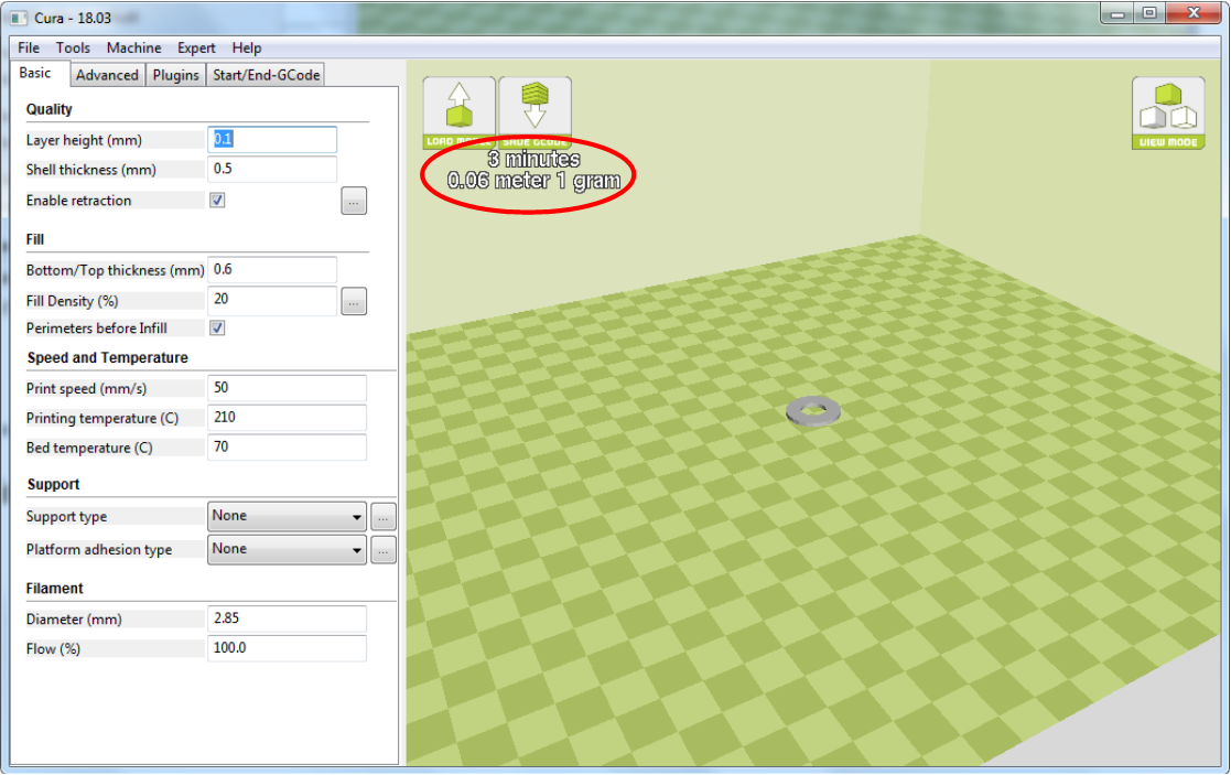 - Click Layer View > Generate if you want to see how much time/filament you will need.