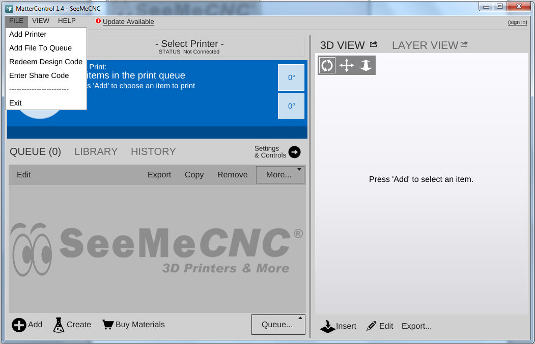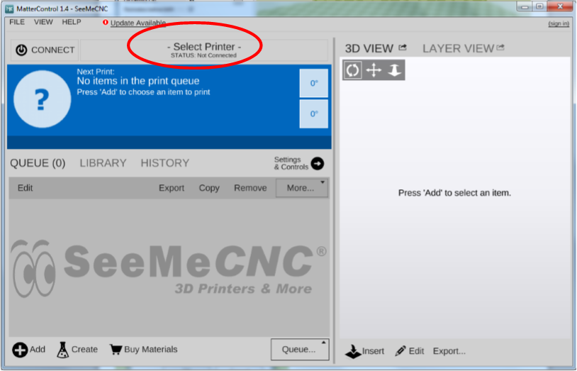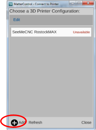 - Be sure your printer is selected (Rostock MAX v2): Select Printer > Add > Select Rostock Max > Save & Continue